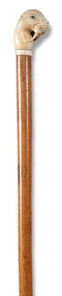 Canne à tête de morse en ivoire, à deux défenses retombant sur le poitrail, yeux de sulfure, bague ivoire, fût jonc clair de Malacca, haute férule corne claire.