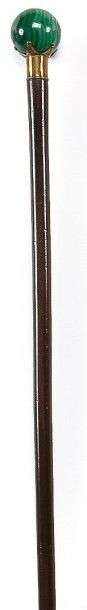 Canne à pommeau sphérique en malachite, bague couronne à cinq branches en métal doré, fût ébène de Macassar, férule laiton.