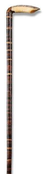 Canne à poignée équerre bombée, en ivoire marin, sur le dessus un mince fragment de coquillage, coude d'angle en bois prolongé par le fût entièrement constitué de rondelles et segment échantillon de bois exotiques enfilés sur une tige d'acier, férule en acier.