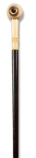 Canne lorgnette de spectacle à pommeau sphérique plat en ivoire, traversé d'une lorgnette télescopique double à monture en laiton doré, longue retombée en ivoire tourné décorée de trois anneaux en relief, fût en ébène, férule en cuivre à talon d'acier.