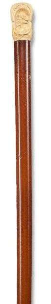 Canne à pommeau tronconique sculpté de trois personnages en buste dans un encadrement d'arcature gothique, chaque personnage est chapeauté et vêtu différemment, fût en jonc de Malacca à ?illetons d'ivoire pour dragonne, la férule à talon d'acier décolleté est surmontée d'une bague de raccordement en corne sombre.