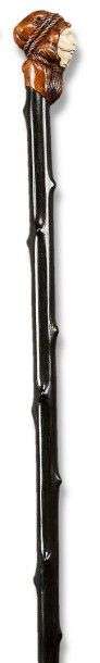 Canne à pommeau sculpté en ronde bosse d'une tête de personnage arabe, le visage en ivoire, fût en ébène sculpté d'épines, férule en ivoire.