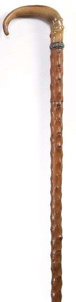 Canne épée à longue lame d'acier (68cm) de section rectangulaire travaillée à deux gorges médianes et de chan freins arrondis sur les arêtes, le ¼ haut est gravé à l'eau forte de «TOLEDO» et d'arabesques. Poignée courbe en corne blonde décorée de gouttes, prolongée par un bois en néflier scarifié dissimulant dans un n?ud le bouton poussoir de verrouillage. Bague anneau en argent, fût en néflier scarifié, férule en laiton nickelé à talon d'acier.