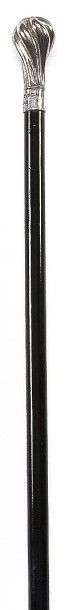 Canne à pommeau «Milord» en métal blanc à décor de côtes torses. Bague ceinture en métal blanc marquée: «PIERRE CARDIN PARIS», fût en bois verni noir avec incrustation dans la partie haute d'une pastille marquée: «RG1867», férule en corne blonde.