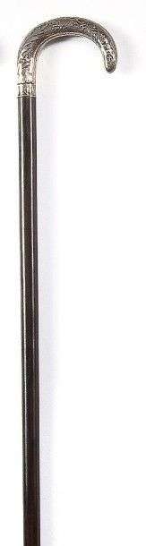 Canne à poignée courbe en argent à décor de feuilles d'acanthe, et fleurs de myosotis, fût en ébène de Macassar, férule en corne sombre.
