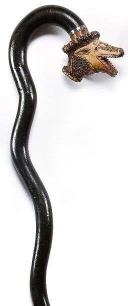 Canne en bois noirci, au fût ondulant en forme de serpent. Poignée courbe