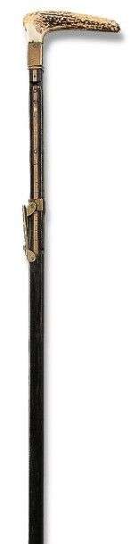 Canne de maître bottier à poignée équerre en bois de cerf, fût carré en bois noirci à double coulisse en trapèze et demi-coulisses d'un seul tenant. Deux becs de pied à coulisse et trois réglets en laiton, permettant de prendre à domicile les mesures de pieds des clients à chausser. Férule carrée en corne claire.