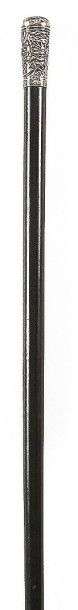 Canne à pommeau Milord tronconique en argent repoussé, à décor extrême oriental d'une pagode animée de deux personnages, fût en ébène, férule en laiton nickelé à talon d'acier.