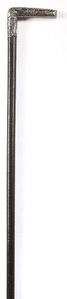 Canne à poignée équerre en métal argenté à décor en relief, feuille et fle