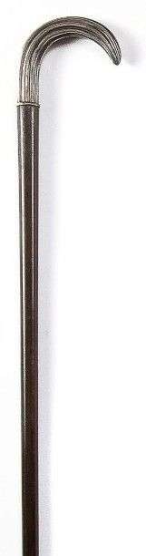 Canne à poignée courbe en argent côtellé,fût en palissandre verni, férule