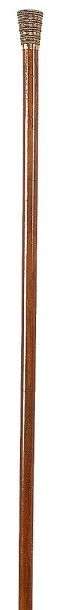 Canne d'enfant à pommeau conique en métal doré à décor en pourtour d'anneaux alternant avec des rangées de perles en relief et de rangées de raies en creux. Fût en jonc de Malacca, férule en laiton à talon d'acier.