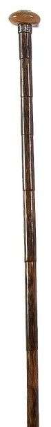 Canne stiletto, à pommeau champignon en corne blonde muni d'un clapet central de fermeture d'où s'éjecte par la force d'inertie une courte lame (17cm) à section quadrangulaire à quatre gorges et maintenue sortie par deux crans d'arrêts latéraux. Bague en métal argenté portant en relief la lettre «L» stylisée, fût en laurier travaillé façon rotin malais, férule en laiton à talon d'acier.