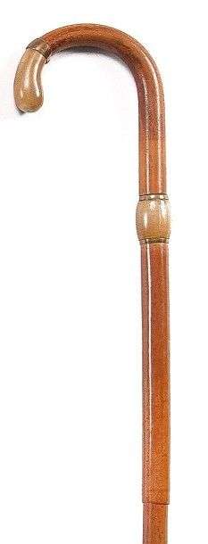 Canne parapluie à poignée courbe en jonc de Malacca et à pointe en corne blonde agrémenté d'une bague laiton doré marquée «DOUBLE», fût fourreau en carton bouilli à l'imitation du rotin, rétractile à trois sections, comportant un parapluie en soie noire, système de fermeture par un ½ tour à logements de deux ergots dans un segment de corne blonde forme tonneau à deux bagues en laiton, férule corne grise. A une époque où le port de la canne était plus élégant que celui du parapluie, ce dernier allait trouver sa place dans la première, comme en témoigne de nombreux brevets.