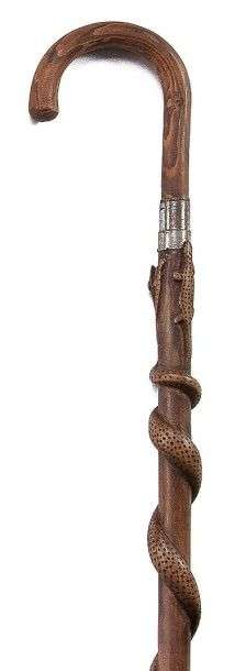 Canne d'art populaire à poignée courbe et longue descente d'un seul tenant en bois verni, prolongées par un poinçon de défense de 10 cm de long se logeant dans le fût, fermant à friction, fût en bois teinté sculpté d'un serpent enroulé en spirale, dont la tête aux yeux cloutés de laiton est entourée de deux serpenteaux et d'un lézard dont les peaux ainsi que celles du serpent sont pyrotachetées de petits trous à l'imitation des écailles, férule en acier à pique de montagne.