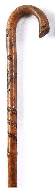 Canne d'art militaire monoxyle en châtaignier pyrotacheté à poignée courbe façonnée en bec de corbin. Fût sculpté successivement en partant du haut sur fond piqueté d'un edelweiss, suivi de: «MENU, JOANNES, SOUVENIR», chaque mot à son initiale stylisée et est inscrit dans un cartouche irrégulier se terminant en forme de queue de poisson, ensuite: «DU» en dessous un cor de chasse marqué au centre: «IIème», suivi d'un personnage en buste coiffé d'un béret, ces deux dernières représentations sont entourées d'un écusson, et pour terminer un c?ur marqué: «CLAN 1902». Férule en acier à pique de montagne.