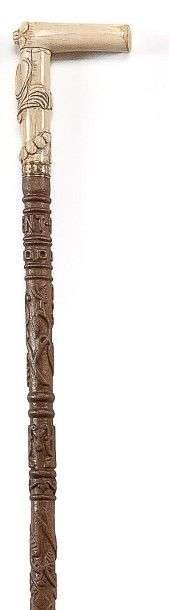 Canne «souvenir» d'art militaire à poignée équerre et longue retombée en ivoirine sculptée de fleurs, de médaillons et d'acanthes. Bague annelée en métal doré à frise d'oves et de losanges, fût en hêtre entièrement sculpté où chaque scène est présentée successivement entre deux anneaux, en partant du haut: «LAURENT» dessous une frise de carrés pointés, rameau spiralé avec feuilles, baies et grappes, motif de lyres, guirlande sinueuse, rameau spiralé avec baies et grappes enroulé d'une bannière marquée: «SOUVENIR DE CAPTIVITE», frise de carrés pointés, chaise, table avec dessus une bouteille de vin, parterre un bol, bannière spiralée marquée: «INGOLSTADT BAVIERE», motifs chevrons, motifs de colonnettes et «1871», férule en laiton.