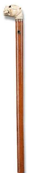 Canne à pommeau en ivoire sculpté en ronde bosse d'une tête de dogue aux yeux de verre, tenant dans sa gueule un os en ivoire, bague lisse en or, fût en jonc de Malacca, à ?illetons d'or ourlé, férule en laiton nickelé à talon d'acier.