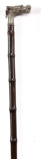 Canne à poignée en bronze argenté, à sujet érotique d'une jeune femme alanguie sur un lit d'ajoncs, fût en bambou brun de Chine, longue férule en laiton, à talon acier à gorges et en pointe.