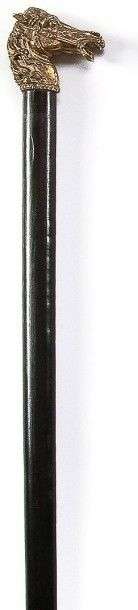 Canne à poignée équerre en bronze doré représentant en ronde bosse une tête de cheval, fût de section elliptique en bois verni noir, férule en laiton.