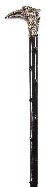 Canne casse-tête à poignée en bronze argenté représentant la tête de «Jean CALVIN», barbu et moustachu, coiffé d'une visière constituée par les plumes arrières d'une tête d'aigle dont le bec pointu forme la poignée de la canne, fût en ébène sculpté d'épines à pointes émoussées, férule en laiton nickelé à talon d'acier.