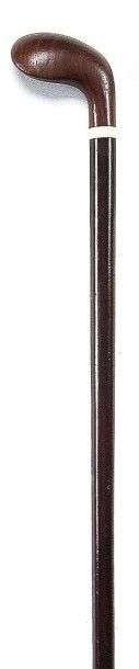 Canne de golf: club de golf. Le club de golf anglais des années 1970 à manche en acier peint imitation bois verni, habillé d'une poignée en caoutchouc noir spiralé, aéré de petits trous, en terrasse une pastille blanche en plastique. Raccord acier peint imitation bois verni, avec sa petite bague imitation ivoire, tête acier forgé. La longueur d'un club de golf peut aller de 90cm à 1m20 (celui-ci mesure 96cm).