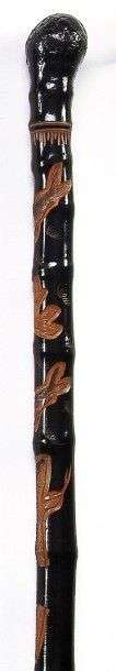 Canne en bambou laqué noir, le pommeau formé de la racine est décoré à la