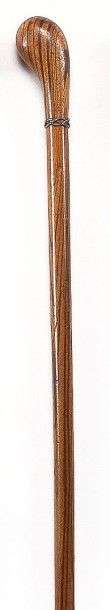 Canne à poignée mailloche en frêne aux veines formant des oves concentriques. Fût en frêne marqué par de fortes veines longitudinales, bague en fil d'argent tressé, férule en corne claire et sombre.