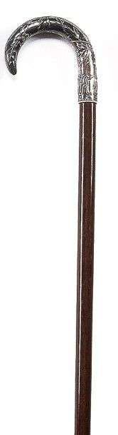 Canne à poignée courbe en argent, à décor de branches de groseillier avec fruits, feuilles au bec, motifs d'entrelacs à la base, fine bague en ivoire, fût en palissandre, férule en laiton nickelé à talon d'acier. Cette poignée à forme ancienne appelée «bec de canne» sans doute en raison de la pointe acérée en bec d'oiseau, peut-être appelée aussi «bec de corbin», qui est l'ancien nom du corbeau dont la forme est recourbée en pointe.