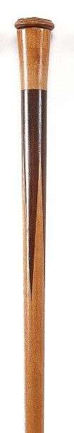Canne à jeux de dominos en carton et dés en os, contenus dans le pommeau cornet à couvercle à vis en bois tourné, fût en marqueterie d'érable et de palissandre, férule en laiton nickelé.