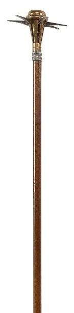 Canne de défense casse-tête «HERISSON» (brevet d'invention BRININGER), pommeau Milord an laiton d'où s'éjectent en tirant la virole vers le bas, six pics pointus en laiton, disposés en étoile régulière autour du pommeau. Haute bague en métal argenté à décor de cercles perlés, gorge et traits, où viennent se centrer les pics en position fermée. Fût en frêne vernis, férule en laiton à talon d'acier.