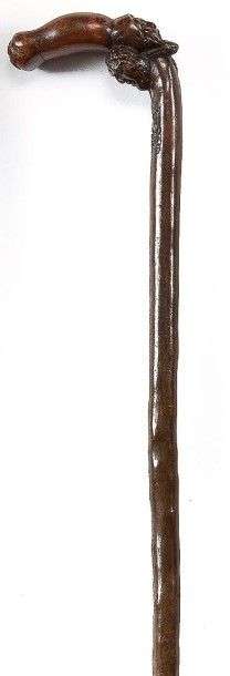 Canne d'art populaire monoxyle à poignée équerre sculptée dans l'angle de deux têtes d'ecclésiastiques. Une retombée à pampre de vigne termine le décor, longue férule stylisée (14cm) en acier à pic de montagne.