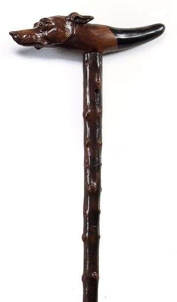 Canne art populaire de «lupanar», à poignée en T, sculptée d'une tête de levrier en bois, yeux de sulfure, fût branche en flèche d'épicéa naturel, férule acier à pic.