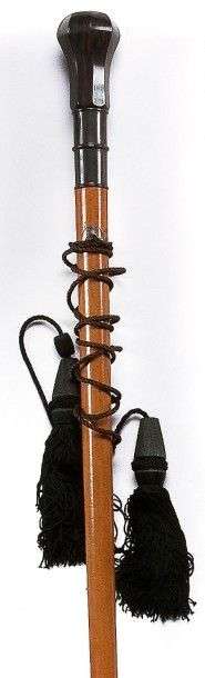 Canne(1,32m) de compagnon charron du «Tour de France», haut pommeau octogonal en corne brune, en terrasse en ivoire gravée en pourtour «DVSCCCDDRALPLP-MDCCCLXIX» entourant l'équerre, le compas et la plane entrecroisés avec «DPL-DL», fût en jonc de Malacca à ?illetons ronds pour passementerie noire à pompons. Haute férule (0m39) dévissable en bronze annelé et moleté de branches d'acacia et colonne à huit pans terminée par un gland d'acier. L'origine du nom de charron serait: char de charpentier, rond pour la roue, personne qui fabrique et répare des chariots, des charrettes, des voitures hippomobiles et dont l'outil principal est la plane, outil à lame concave munie de deux poignées à ses extrémités, pour dégraisser les pièces de bois, si l'équerre et le compas s'entrecroisent les deux forces (matérielles et spirituelles) s'équilibrent. Les renseignements gravés sur la pastille d'ivoire concernent le compagnon. Pour les lettres inscrites sur cette canne: «DVSC» sont les initiales du nom et surnom du compagnon, ensuite «CCDD»: Compagnon Charron Du Devoir, puis: «RALPLP: Reçu à Lyon Pour La Pâques» «MDCCCLXIX»: 1869. L'équerre: rectitude, équité, droiture dans les pensées et les actions, le compas: instrument de mesure et de comparaison, symbole de la sagesse.