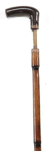 Canne toise hippométrique de maquignon, à poignée équerre en corne sombre travaillée façon épineuse, en la tirant il en sort une tige carrée en laiton graduée en cm coulissante jusqu'à 1,72m, laquelle contient une potence dépliable en acier, maintenue à l'équerre par un taquet à ressort, fût en rotin tavelé, bague en métal doré, férule en acier. La canne de maquignon était à l'origine destinée aux marchands de chevaux.