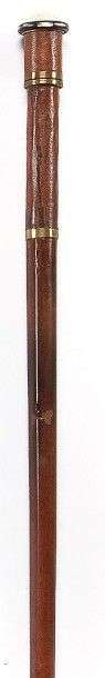 Canne bougie à pommeau calotte en ivoire sculpté d'un motif rocaille cerclé de nacre, la retombée est recouverte de cuir brun se terminant par une bague en laiton doré. Le pommeau se déverrouillant découvre placé en haut du fût une petite chandelle logée dans un étui métallique à couvercle percé au sommet permettant en le vissant le passage de la mèche, un coupe vent cylindrique en bronze ajouré coulisse à l'intérieur de la canne. Longue descente recouverte de cuir se terminant par une bague en laiton dorée intercalée avec le fût en jonc de Malacca, férule en laiton à talon d'acier.