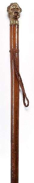 Canne à pommeau en bronze doré, à représentation d'une tête de «BACCHUS», fût en jonc de Malacca, oeilletons avec dragonne en lacet tressé, férule laiton à talon d'acier.
