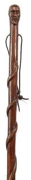 Canne d'art populaire monoxyle en frêne, à pommeau sculpté en ronde bosse d'une tête d'homme moustachu. Dessous ?illetons pour dragonne à lacet de cuir, un serpent sculpté tête en haut aux yeux cloutés s'enroule le long du fût, férule en laiton à talon d'acier.