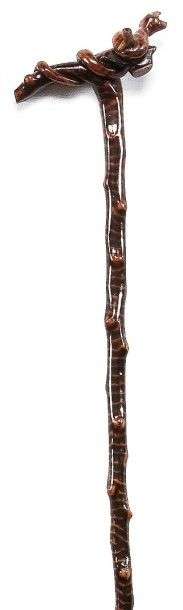 Canne d'art populaire pour fumeur, monoxyle en aubépine à poignée «TAU», sculptée d'une branche enroulée d'un serpent aux yeux cloutés, gueule grande ouverte, le corps forme une boucle se refermant sur l'embout d'un fume-cigarette situé à l'extrémité de la poignée, fût décoré d'anneaux brunis à la flamme sur fond brun clair, férule en laiton.