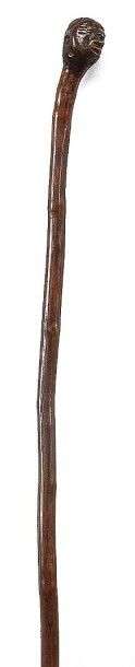 Canne d'art populaire monoxyle en branche naturelle de houx à poignée sculptée dans la racine d'une tête d'homme hideux.