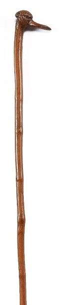 Canne animalière en branche naturelle de houx, à poignée équerre sculptée en ronde bosse d'une tête d'oiseau spatule à huppe et yeux de sulfure, le fût présente de légers bossages circulaires, férule en laiton.