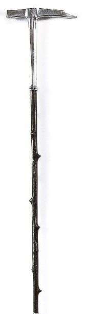 Canne de géologue à poignée «TAU» marteau et pic en acier nickelé à longue retombée octogonale se terminant par une bague (anneau), fût en acier forgé de 19 épines et verni noir. Canne souvenir offerte en fin de carrière à un membre de la corporation des ingénieurs des mines. marteau et pic étant les outils symboliques de la profession, les épines du fût symbolisent les difficultés rencontrées tout au long de la vie professionnelle de la personne concernée.