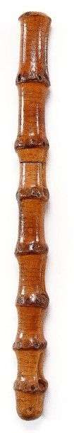Petite canne dague (24cm) de poche, à lame couteau pointu (14cm) à un dos et un tranchant gravée à l'au forte et en réserve sur une face «RECUERDO» (souvenir) et sur l'autre «DE TOLEDO» (de Tolède) avec motifs de contre courbes stylisées, fût et poignée en bambou de Java, dissimulant dans un n?ud le bouton poussoir de verrouillage, pas de férule.