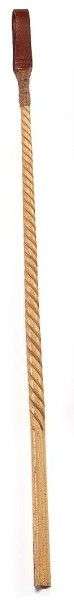 Cravache (70 cm) de cavalier à manche flexible en bois de micocoulier, le 1/3 haut du manche est en cône lisse pour la tenue en main, le reste est décoré d'une torsade à quatre brins. La tapette en crin située à l'extrémité est en forme de boucle, liée au manche par l'enroulement d'un fil de chanvre.