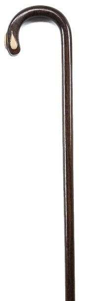 Canne à poignée courbe et fût d'un seul tenant en bois de palissandre, l'extrémité de la poignée travaillée en carré est incrustée en fort relief sur trois faces d'une amande en ivoire, férule en corne blanche.