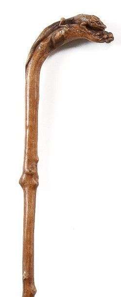 Canne d'art populaire monoxyle à poignée courbe sculptée dessus en haut relief d'un grand lézard sur la branche d'un houx, le fût présente en pourtour et sur toute la hauteur les noeuds de branches coupées.