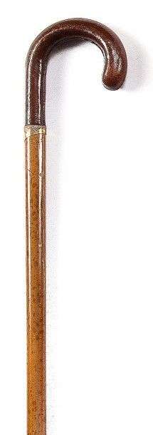 Canne à poignée courbe gainée de cuir, bague en métal doré à décor de gout
