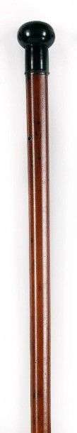 Haute canne (1m27), de compagnon du Tour de France, à pommeau rond dévissable incrusté en terrasse d'une pastille vierge en os, longue retombée annelée en corne sombre tournée, fût en jonc de Malacca à oeilletons ronds en laiton, longue férule conique (38 cm) en laiton dévissable.