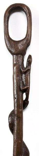 Canne d'art africain monoxyle à poignée évidée, fût sculpté d'un serpent enroulé, dévorant un lézard.