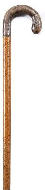 Canne à poignée courbe en corne, fût en bois.~