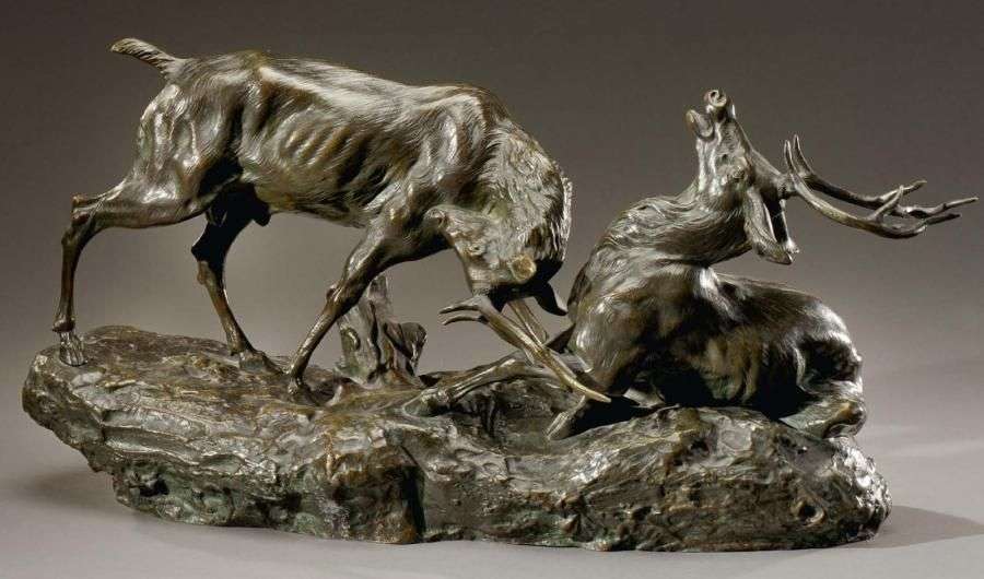 « Combat de cerfs » Bronze, à patine brune, signé sur la terrasse.